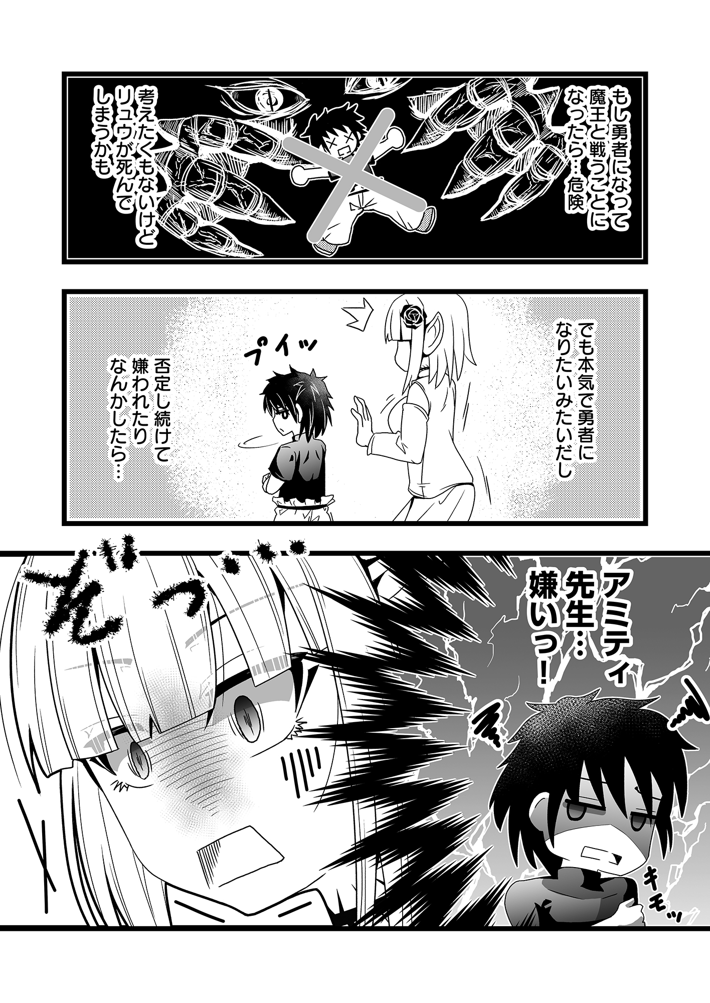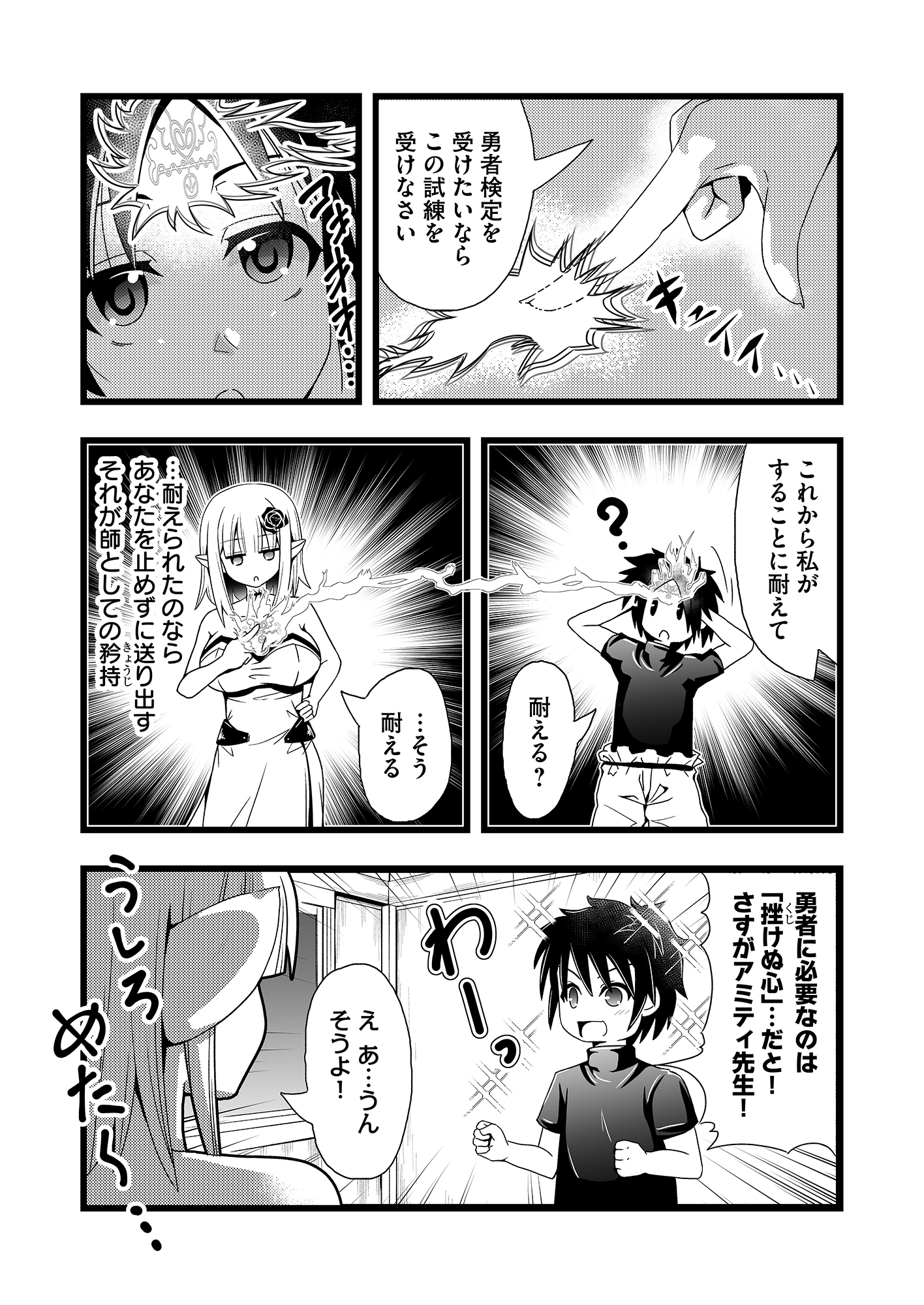 弟子のリュウと共に暮らす爆乳エルフのアミティ。彼女は魔王を倒す存在「勇者」を志しているリュウに自分の元から離れてほしくない一心で、レベルを下げるためのレベルドレインを施す。